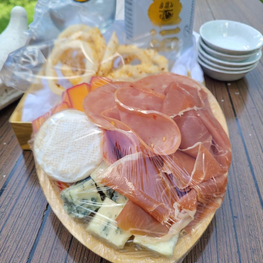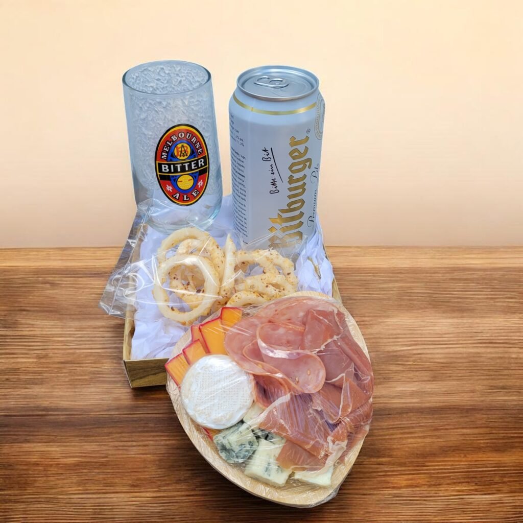 Uma bela caixa com fita contendo 1 cerveja alemã Bitburger, 1 copo tulipa, 1 mini tábua de frios de laço.