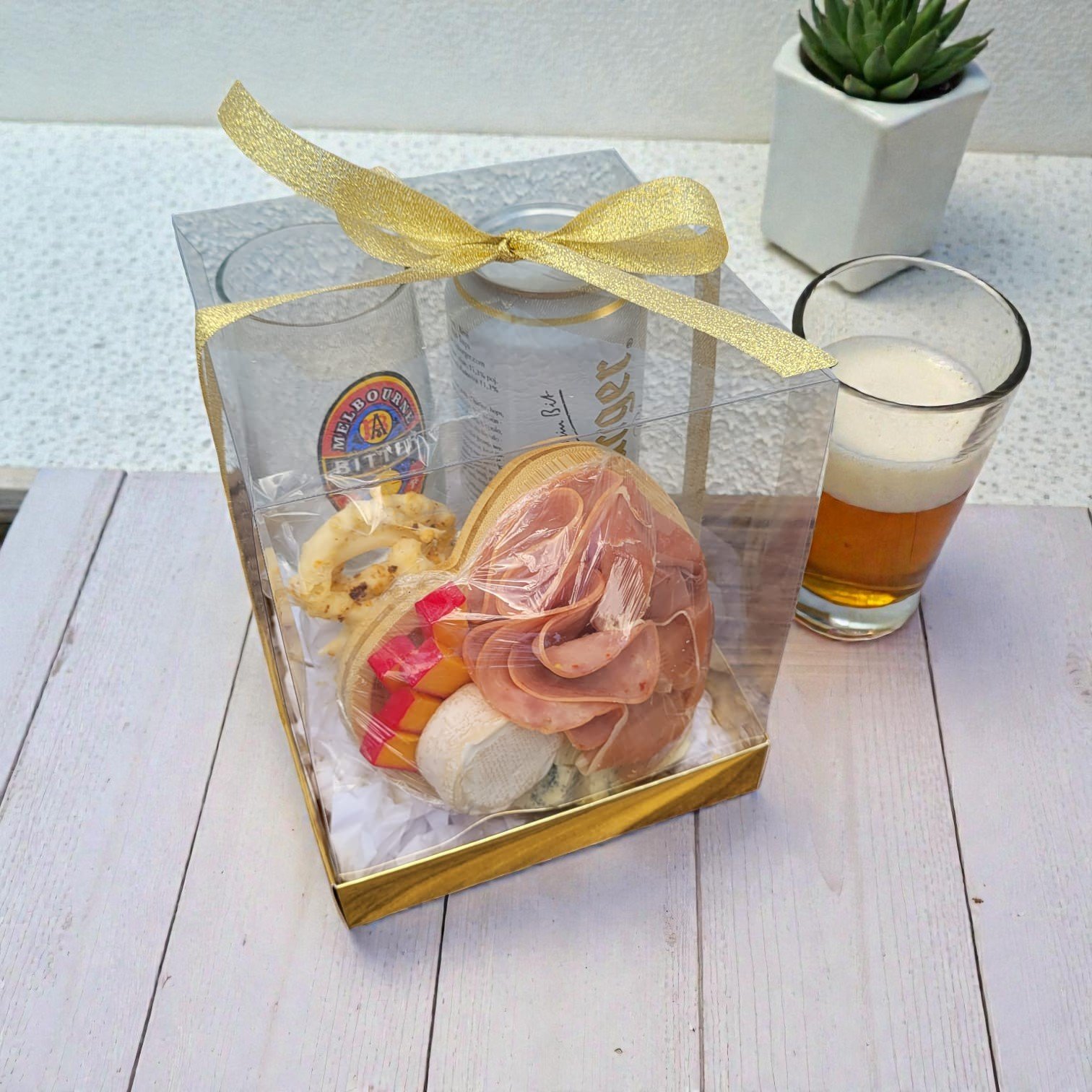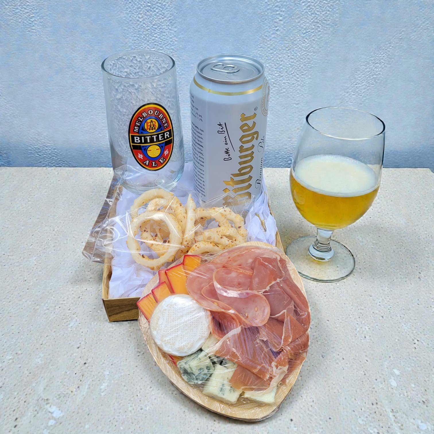 Uma bela caixa com fita contendo 1 cerveja alemã Bitburger, 1 copo tulipa, 1 mini tábua de frios de laço.
